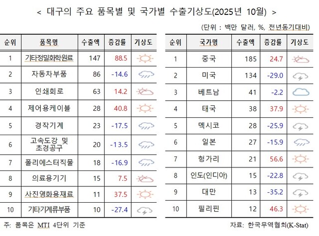 한국무역협회 대구경북지역본부 김동욱 팀장은 “대구는 조업일수 감소로 수출이 일시적으로 위축됐지만 이차전지소재·인쇄회로 등 신성장 품목이 견조한 흐름을 유지하고 있는 점은 긍정적”이라며 “경북은 미국발 통상 리스크의 영향이 크게 나타나고 있어 업종별 대응 전략 마련이 시급하다”고 말했다.