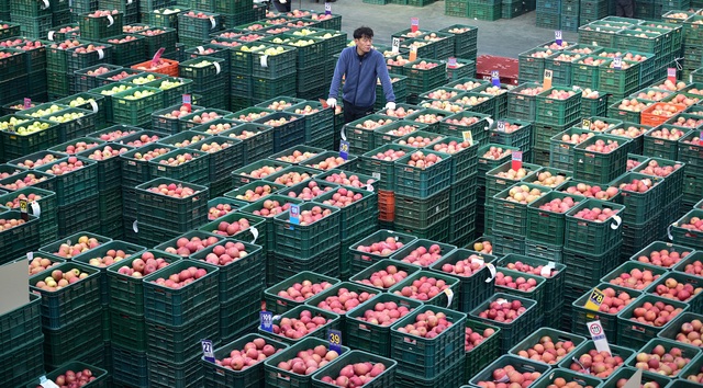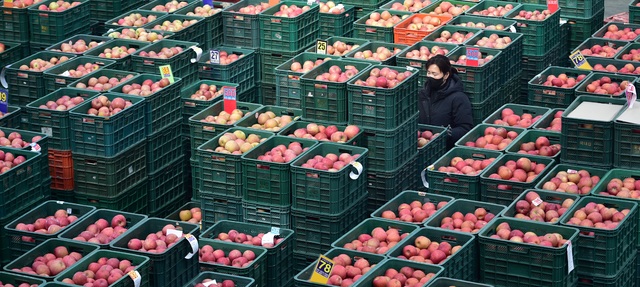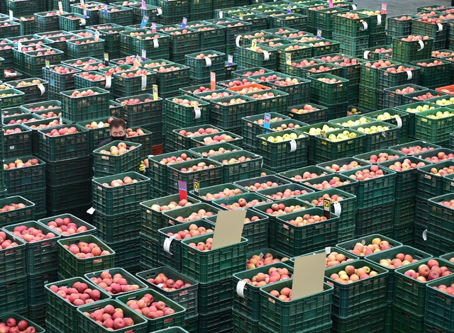 3일 오후 경북 안동시 풍산읍 농산물도매시장에서 만생종 사과가 본격적인 출하를 시작했다. 이날 경매장에 부사 등 가을사과가 수북이 쌓여 있다.