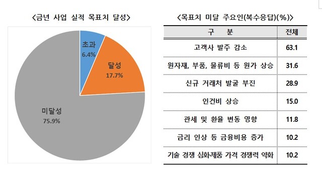 기업들의 실적 부진 원인으로는 ‘고객사 발주 감소’가 63.1%로 가장 많았고 ‘원자재·부품·물류비 상승’ 31.6%, ‘신규 거래처 발굴 부진’ 28.9%, ‘인건비 상승’ 15.0%, ‘관세 및 환율 변동 영향’ 11.8% 등이 뒤를 이었다.