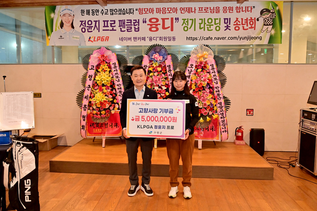 고령군 출신 프로골퍼 정윤지 선수가 지난 23일 고령 마스터피스cc에서 ‘제3회 정윤지 프로 팬클럽 융디 정기라운딩’을 개최했다. 이날 크럽하우스 식당에서 열린 팬클럽과 만남 행사에서 고향사랑기부금 500만 원을 기탁했다.