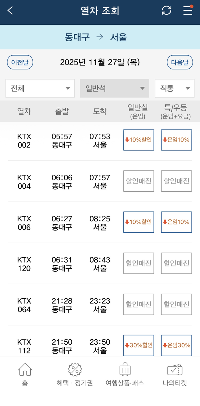또한 가장 인기가 많은 동대구~서울 노선의 경우 26일 기준 할인 혜택을 받는 시간대는 12개지만 오전 5시57분 첫차 이후 6시30분까지 할인이 적용되고, 낮 시간은 아예 적용이 없었다. 이후 심야시간대인 오후 9시28분~오후 10시57분 출발 노선이 할인 혜택을 받는다. 주말의 경우는 심야시간대만 할인 혜택을 받으며 당일 예약이 되지 않아 급박하게 열차를 이용해야하는 경우에는 사용할 수 없다.