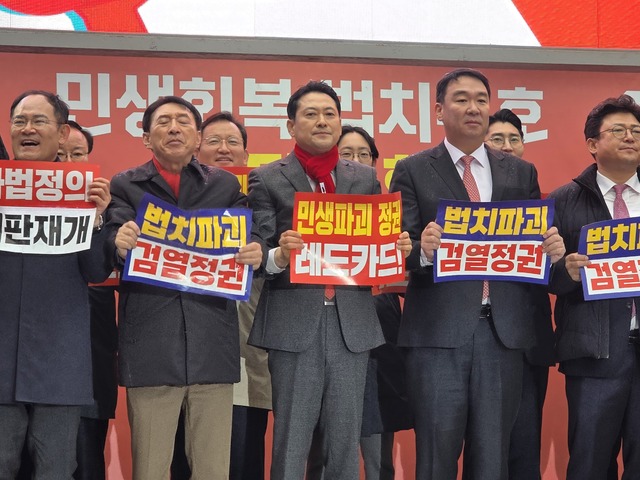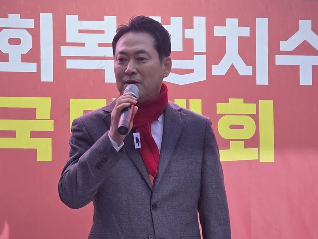 국민의힘 장동혁 대표가 25일 경북 구미에서 열린 ‘민생회복 법치수호 국민대회’에서 이재명 정부를 향해 강도 높은 비판을 이어가며 당내 단결을 촉구했다. 장 대표는 “아스팔트 세력이라 손가락질받는 것보다 나라가 쓰러져 가는데도 한 마디 못하는 것이 더 부끄러운 일”이라며 “조금만 더 믿고 지켜봐 달라”고 지지를 호소했다.