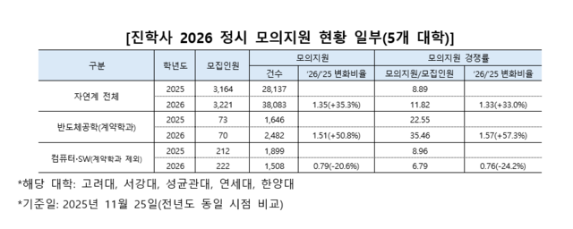 2026학년도 대입 정시에서 반도체 분야 학과에 지원한 이공계 수험생 비율이 지난해보다 크게 증가한 것으로 조사됐다.
